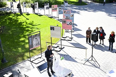 Horn Márton, a Magyar Zene Háza intézményigazgatója beszédet mond a Duett: zene és fényképezés című tablókiállítás megnyitóján a Múzeumkertben 2025. október 7-én. A Magyar Nemzeti Múzeum és a Magyar Zene Háza közös kiállítása december 7-ig látogatható